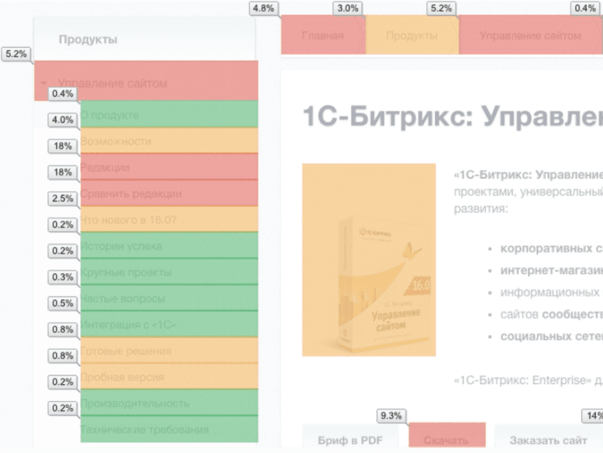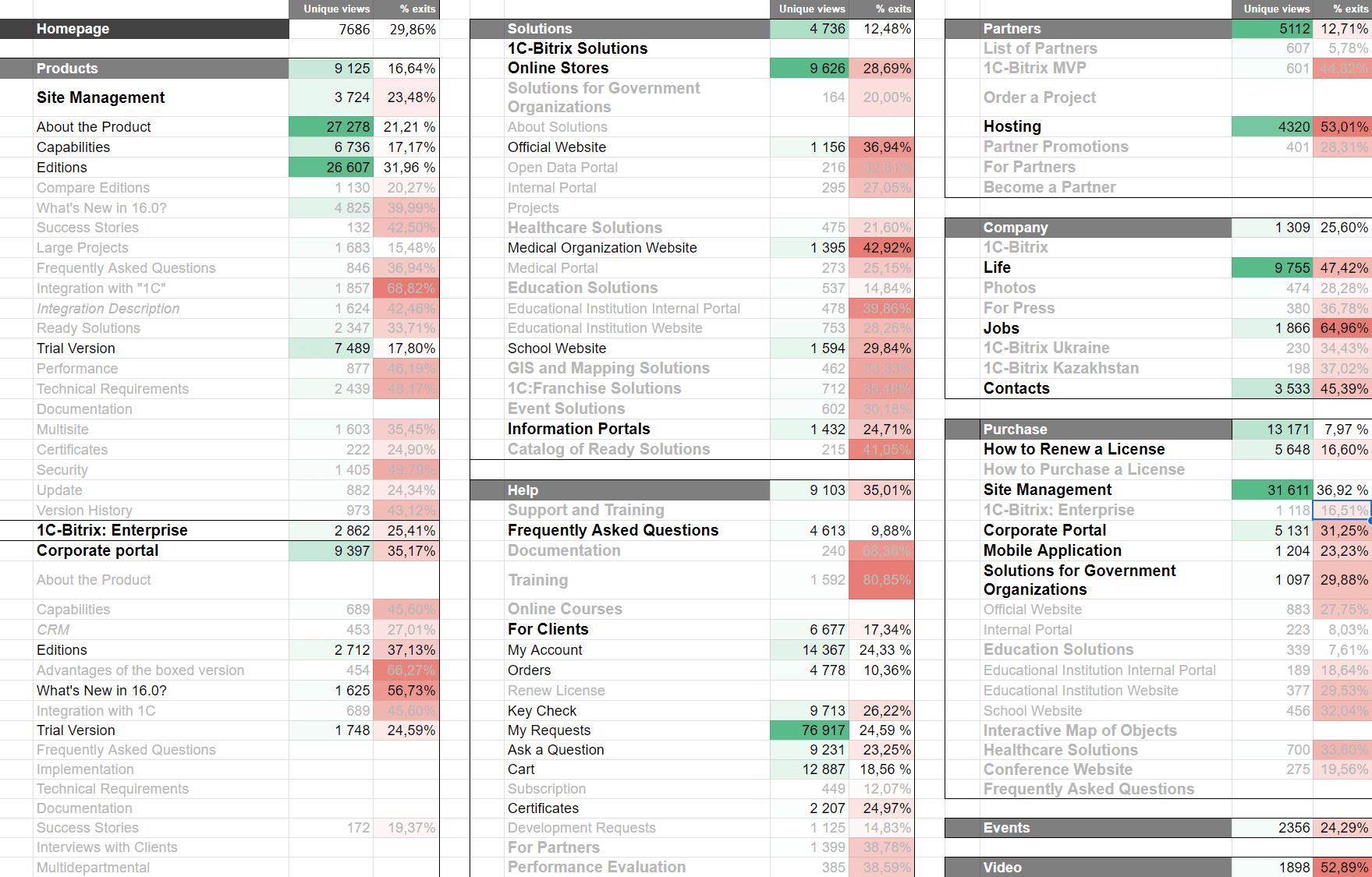 Затем мы разработали карту на основе данных аналитики, выделив самые посещаемые и наименее посещаемые разделы сайта.