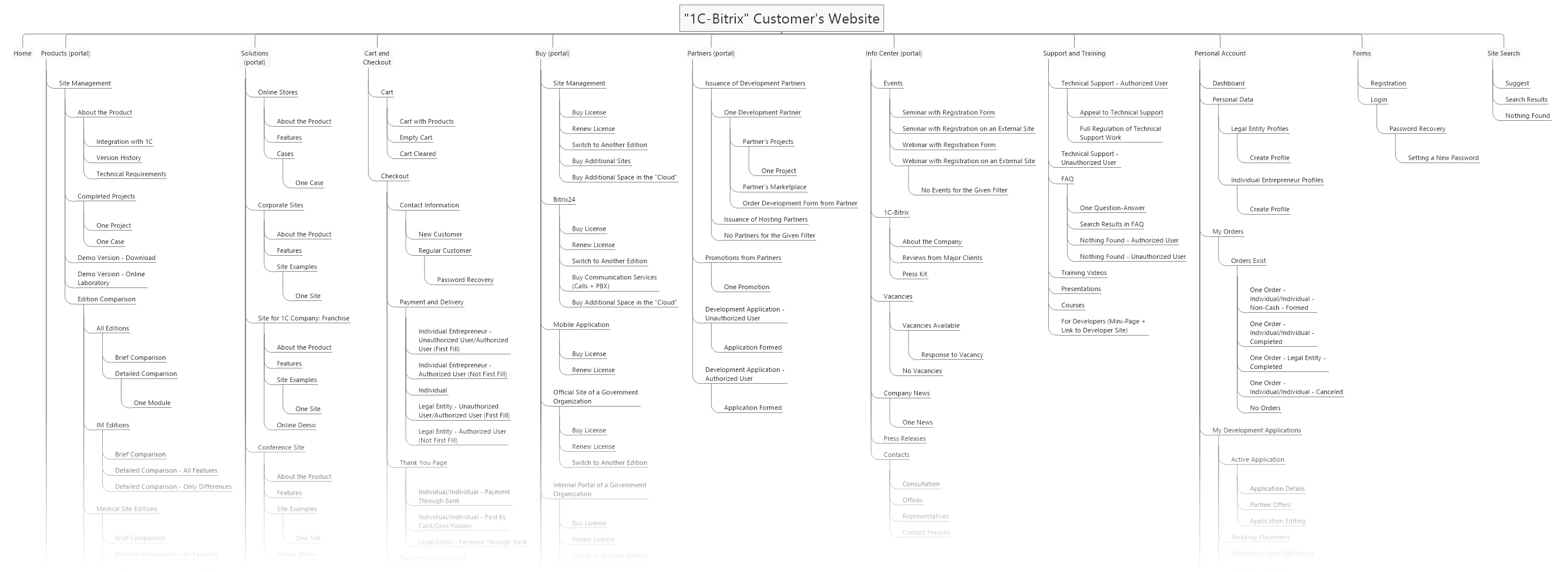 Я разработал структуру для веб-сайтов клиента и партнёров на основе всех данных, собранных в процессе работы, с целью организации контента и обеспечения логичной навигации. Структура оказалась довольно обширной, поэтому здесь я представляю лишь её часть. Полная структура доступна по ссылкам внизу.