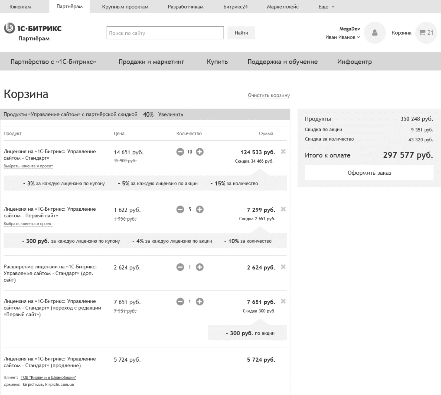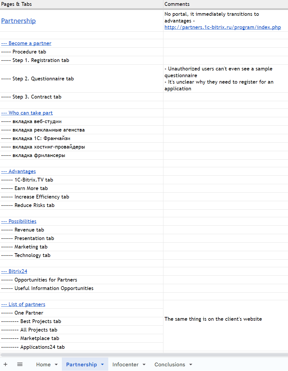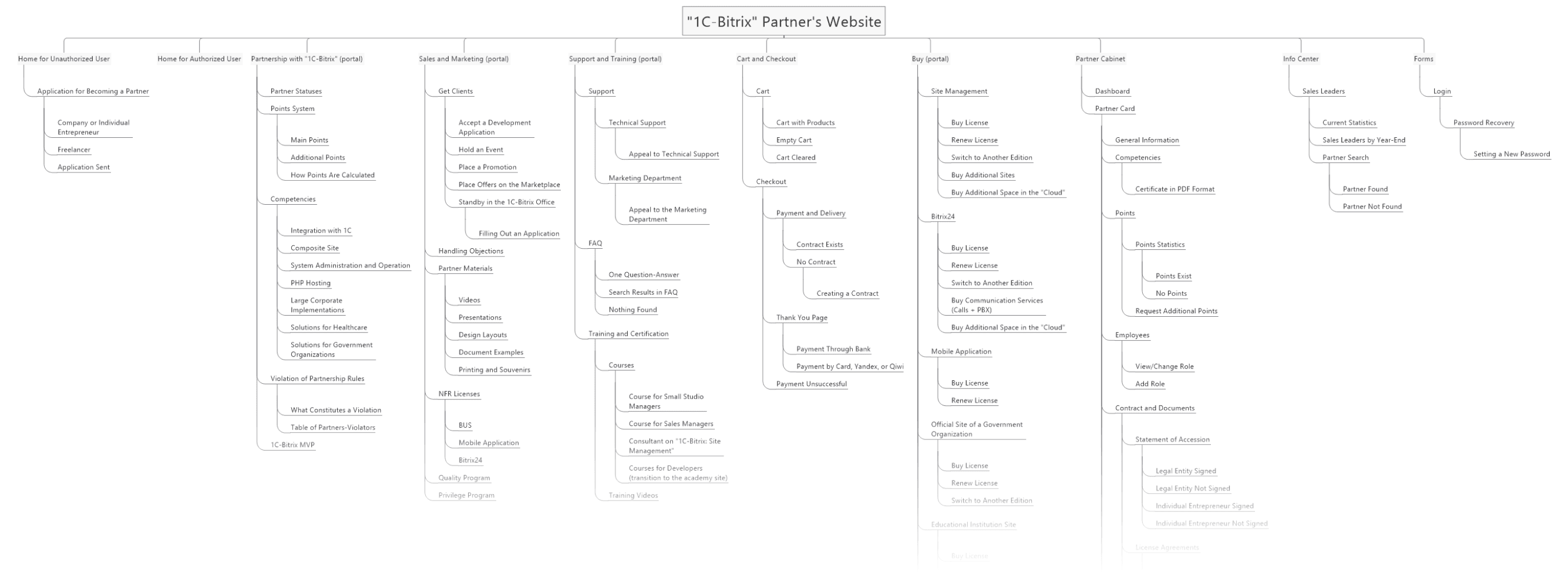 Изначально я пересмотрел структуры как сайта клиента, так и партнера в экосистеме 1C-Битрикс, чтобы получить более глубокое понимание содержания сайтов.