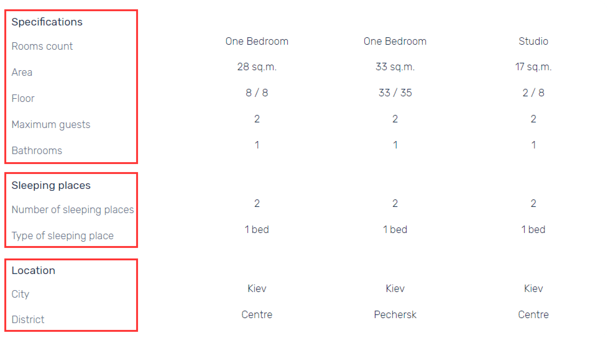 Плохо структурированная информация о сравниваемых апартаментах, без разделения на блоки. Визуально информацию было сложно воспринимать.