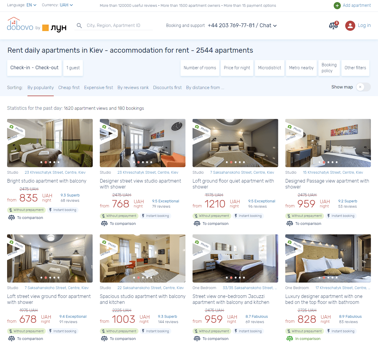 Страница с поисковой выдачей является одной из ключевой на сайте — в подавляющем числе случаев выбор апартаментов происходит именно на ней.
