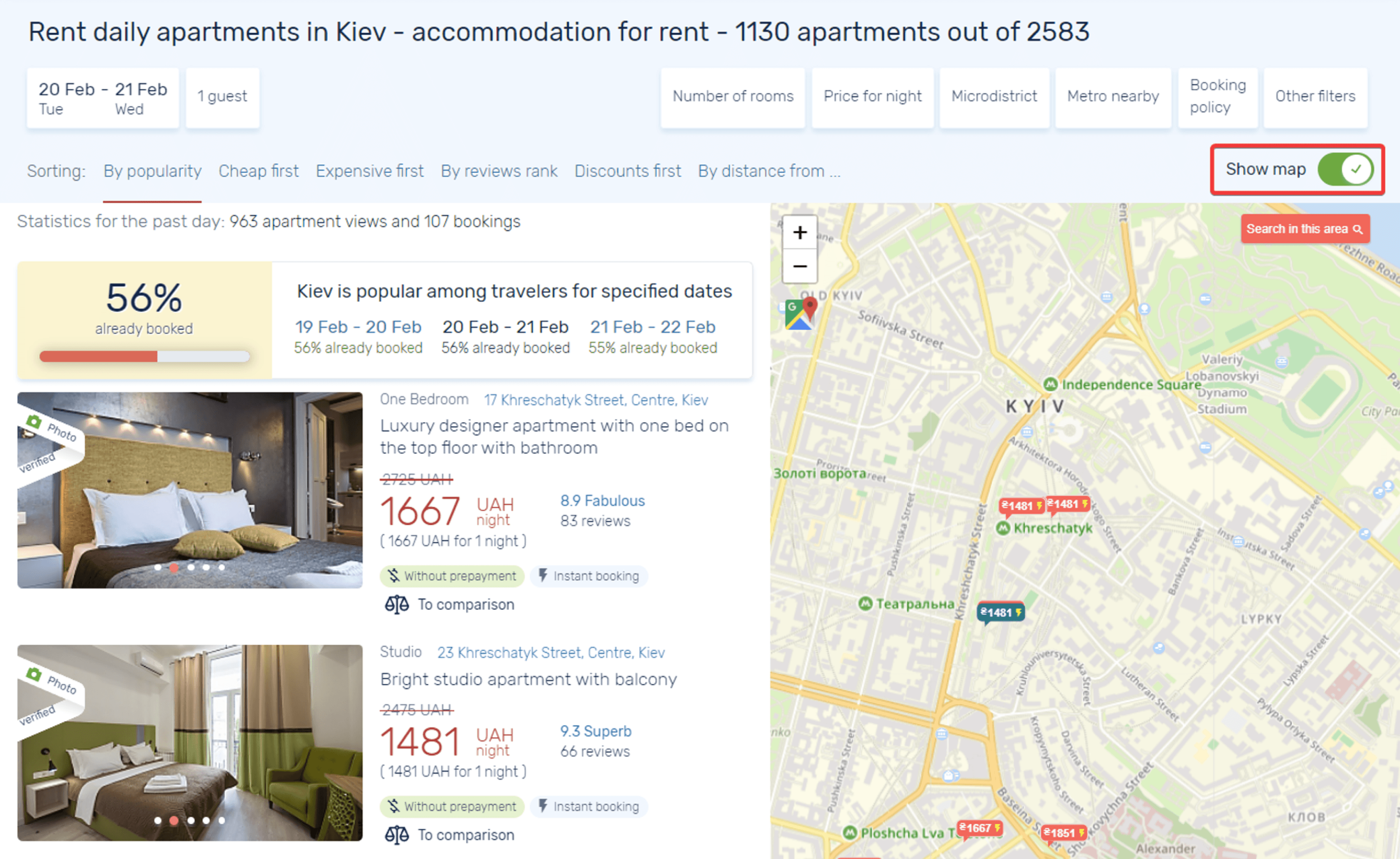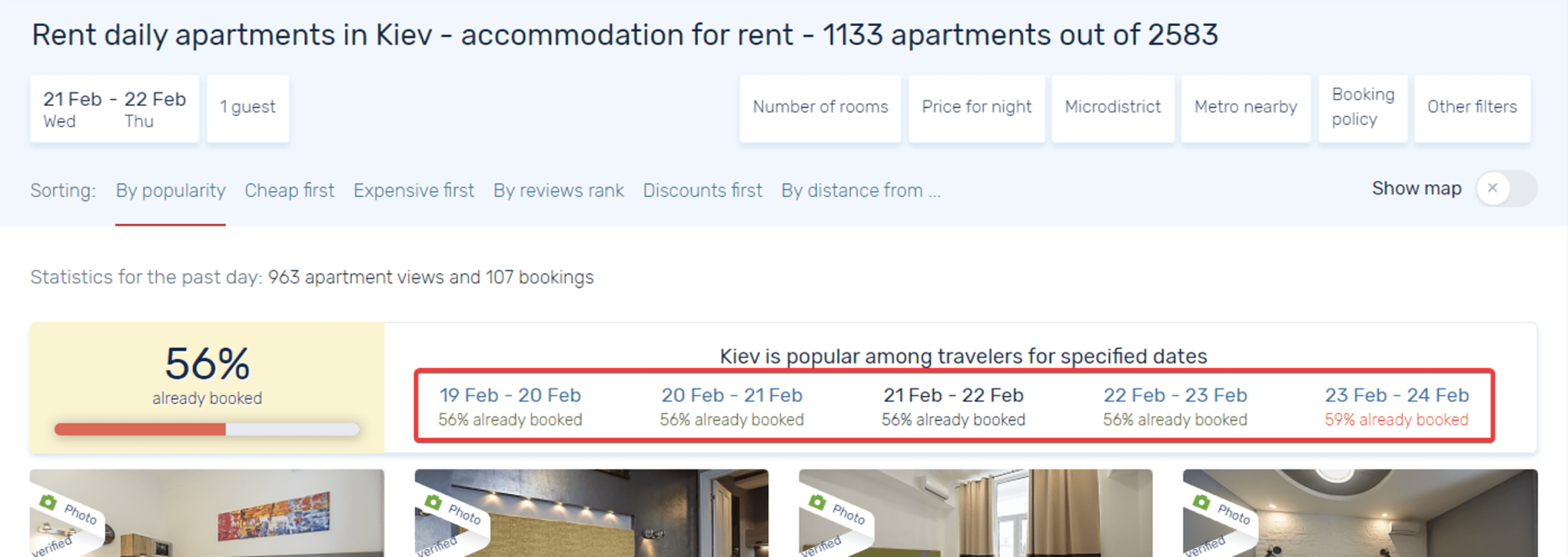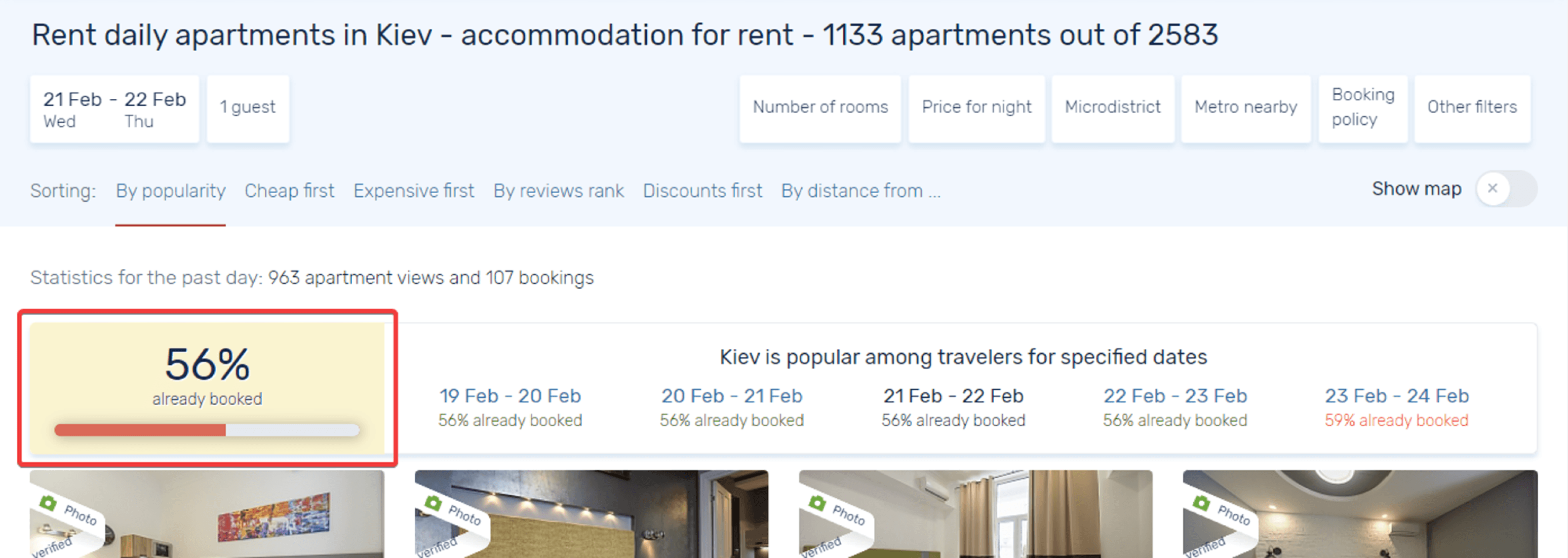 Добавил информацию, на сколько процентов апартаменты забронированы на выбранные даты. Если процент высок — это может заставить пользователя поторопиться совершить бронирование.